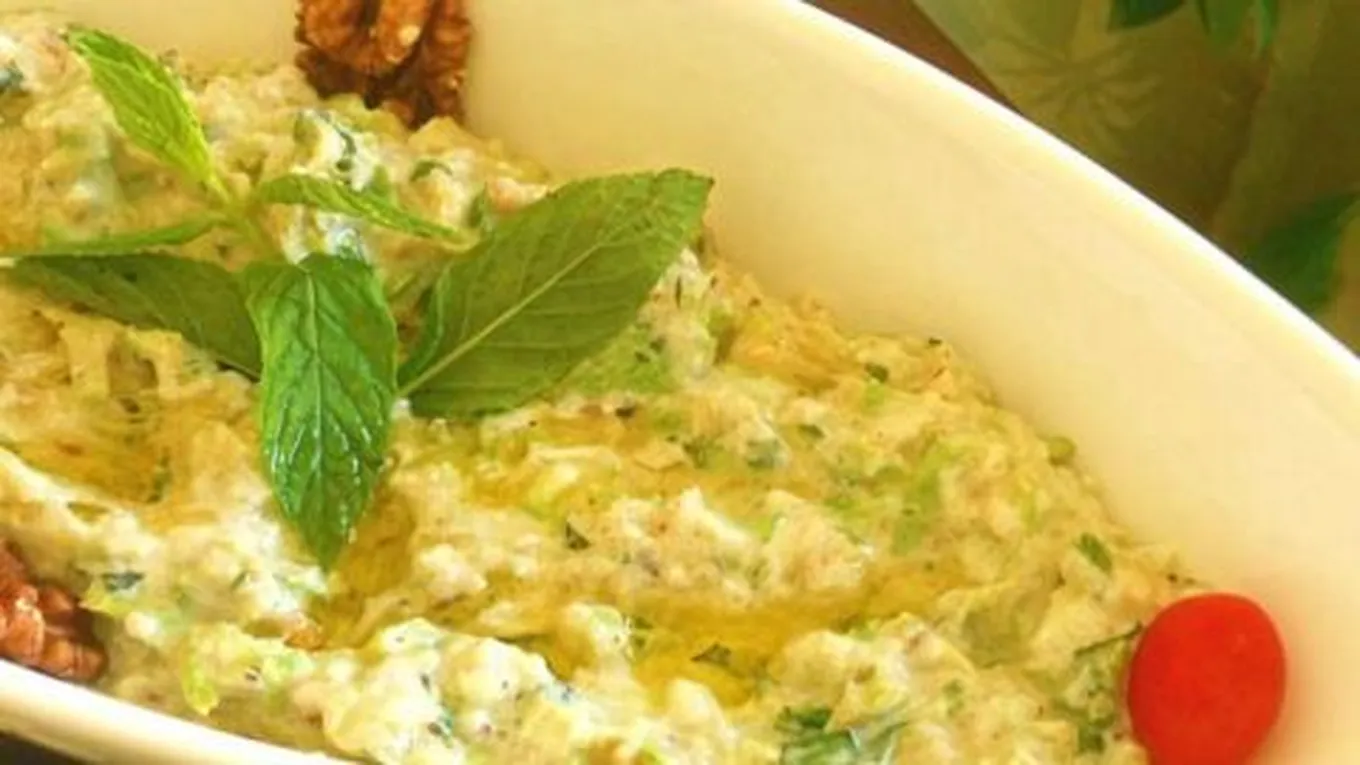 - اهرسي الكوسا في وعاءٍ كبير ثمَّ أضيفي لها الملح، والنعنع، والثوم، واللبن.