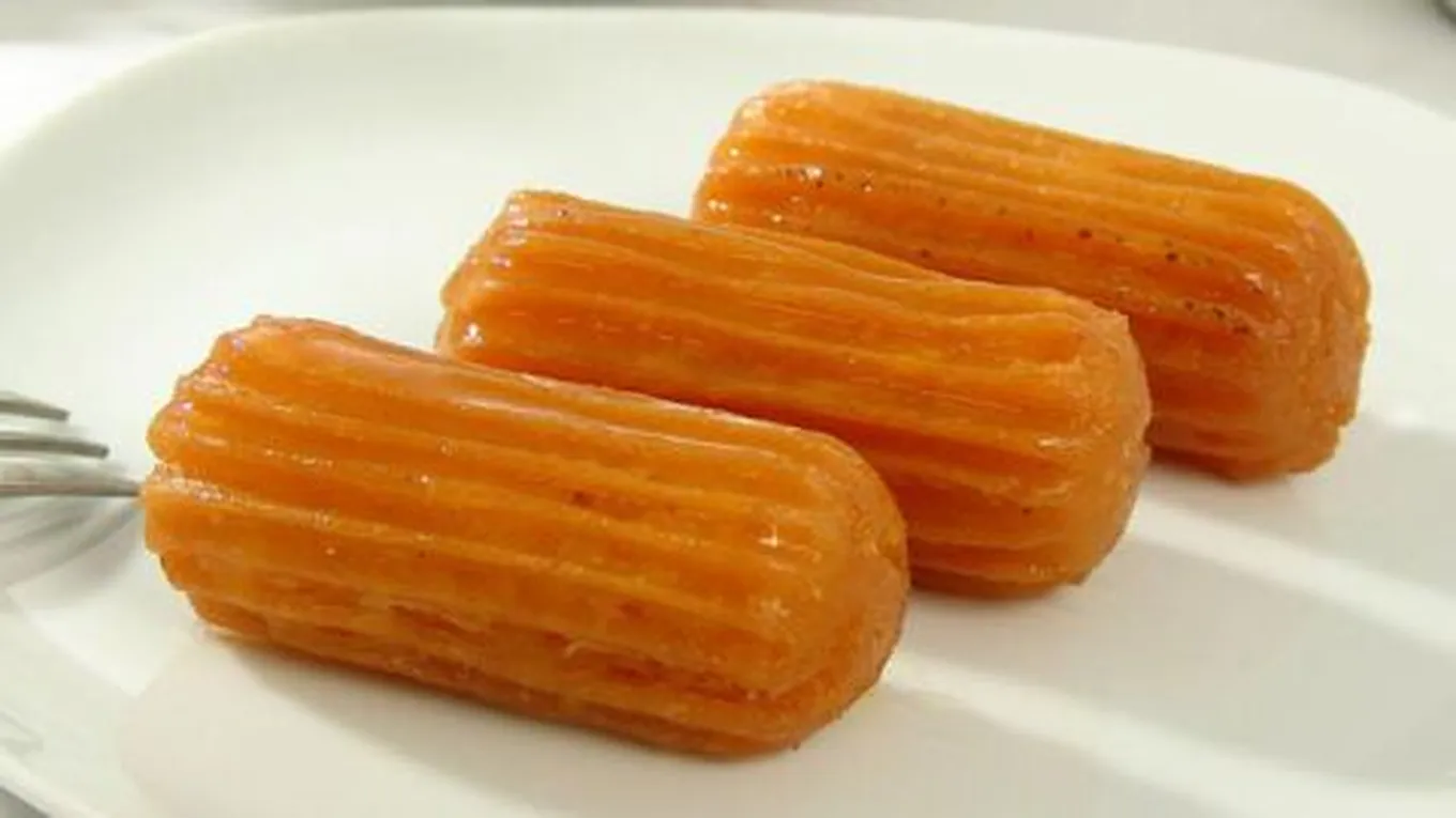 - نسكب العجينة في كيس الحلويّات، ونعصرها في الزيت الساخن لتشكيل بلح الشام.