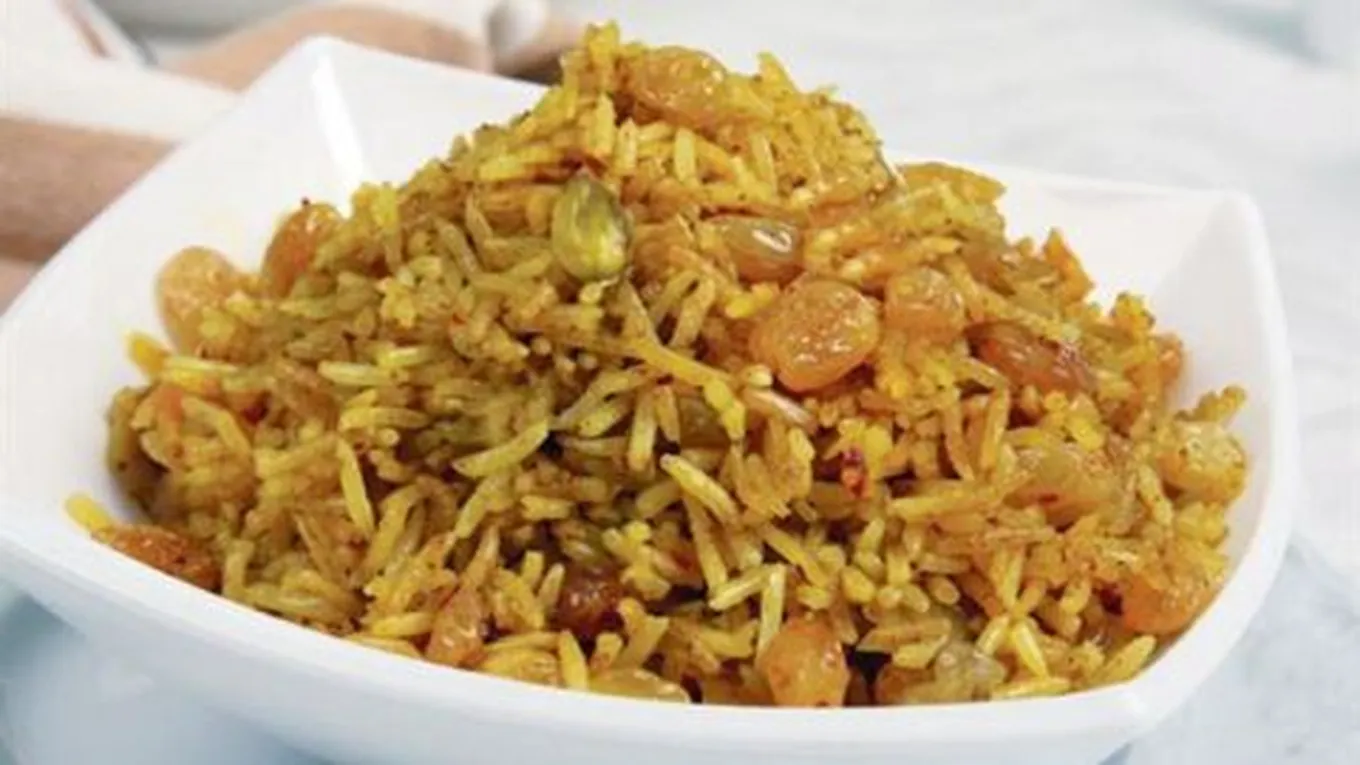 - سكب الأرز في طبق التقديم، وتوزيع خلطة الكبدة واللحم عليه، ثمَّ توزيع الزبيب واللوز عليه.