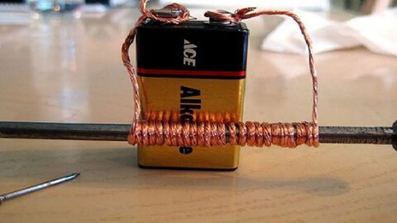 - لف السلك بشكل دقيق حول المسمار مع التأكد من ترك طول مناسب من السلك لوصله بالبطارية، وينبغي الانتباه إلى لف السلك باتجاه واحد؛ لأنّ اتجاه المجال المغناطيسي يعتمد على اتجاه التيار الكهربائي المتدفق بالسلك.