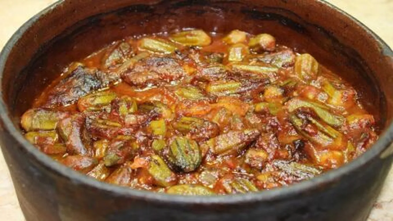 - تُضاف البامية، وصلصة الطماطم، ويُسكب فوقها مرق اللحم حتى يغمرها.