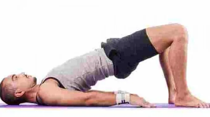 - شد عضلات المعدة إلى الداخل مع دفع منطقتي الحوض وأسفل الظهر نحو الأعلى، مع بقاء الأكتاف والقدمين فقط على الأرضية.