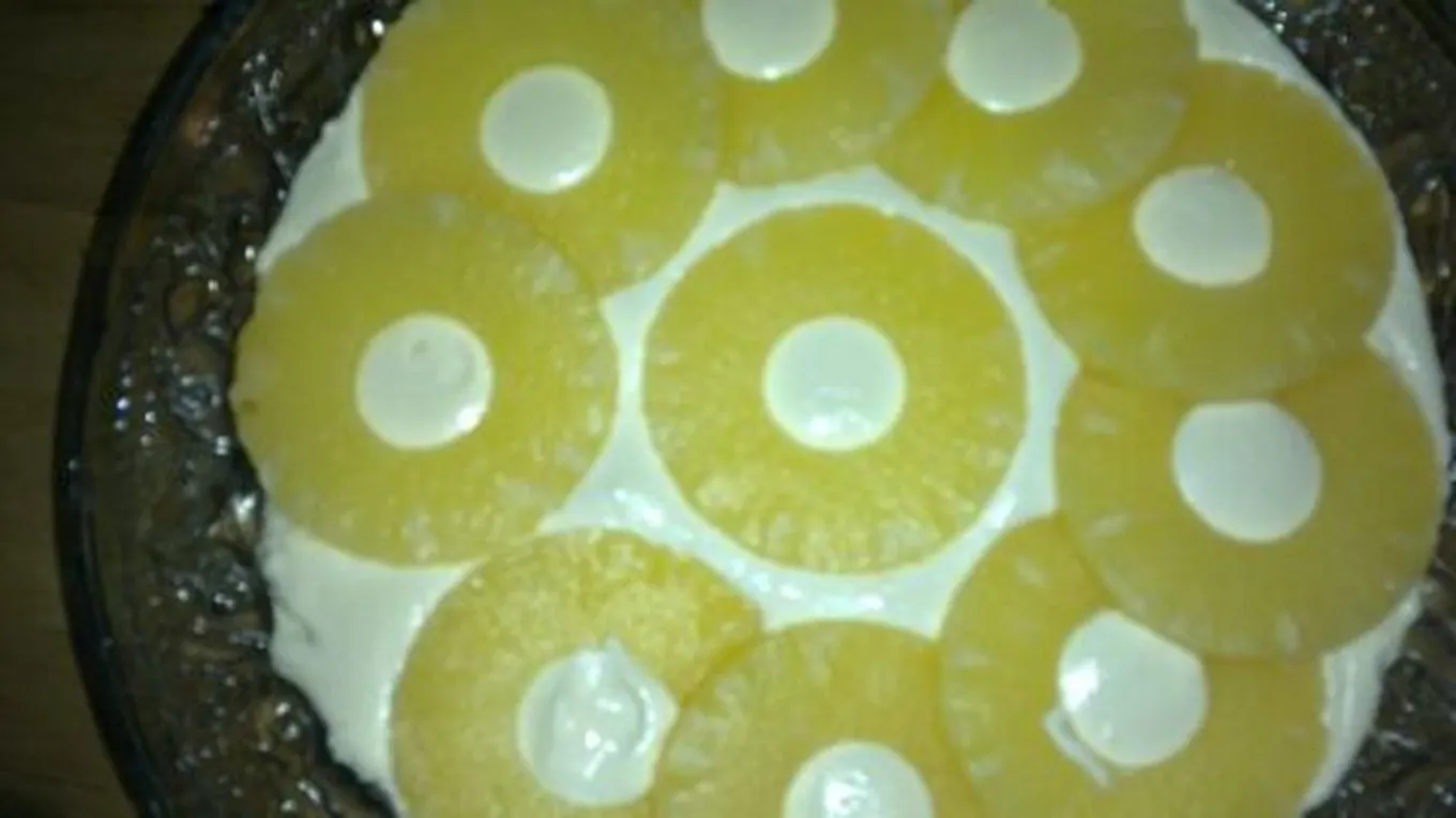 - نضع فوق شرائح الأناناس حبة من الكرز، وربع كأس من خليط العجين.