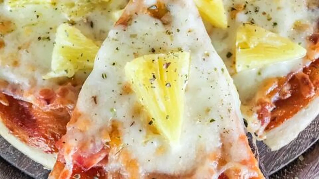 - فرد صلصة الطماطم أو صلصة البيتزا و وضع طبقة من الأناناس و السلامي و رش جبنة الموزاريلا.