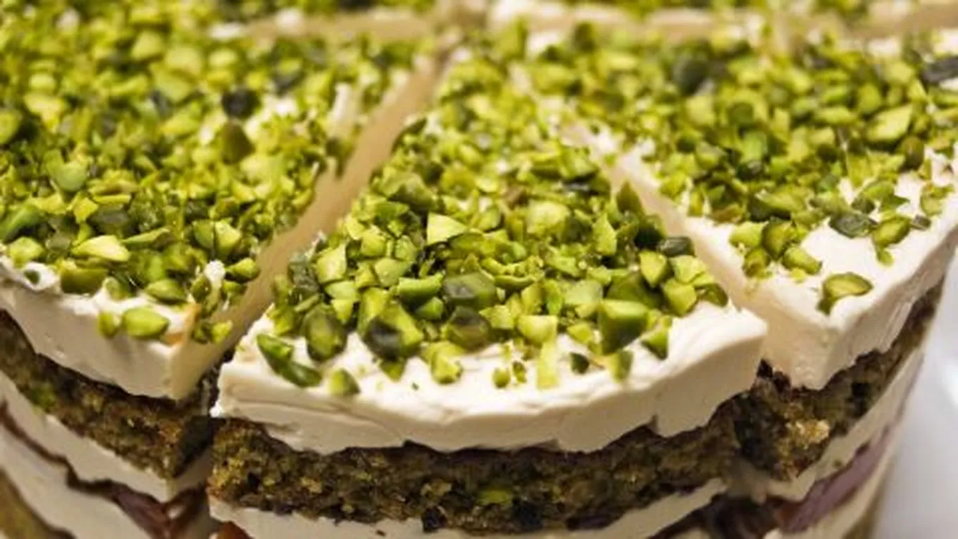 - مد كريمة الفستق الحلبي على الوجه، وتسويتها جيداً.