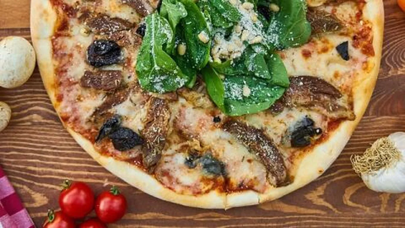 - إخراج البيتزا من الفرن وإضافة اللحم المجفف، والجرجير، وشرائح البارميزان، ورشّ الفلفل الأسود الطازج.