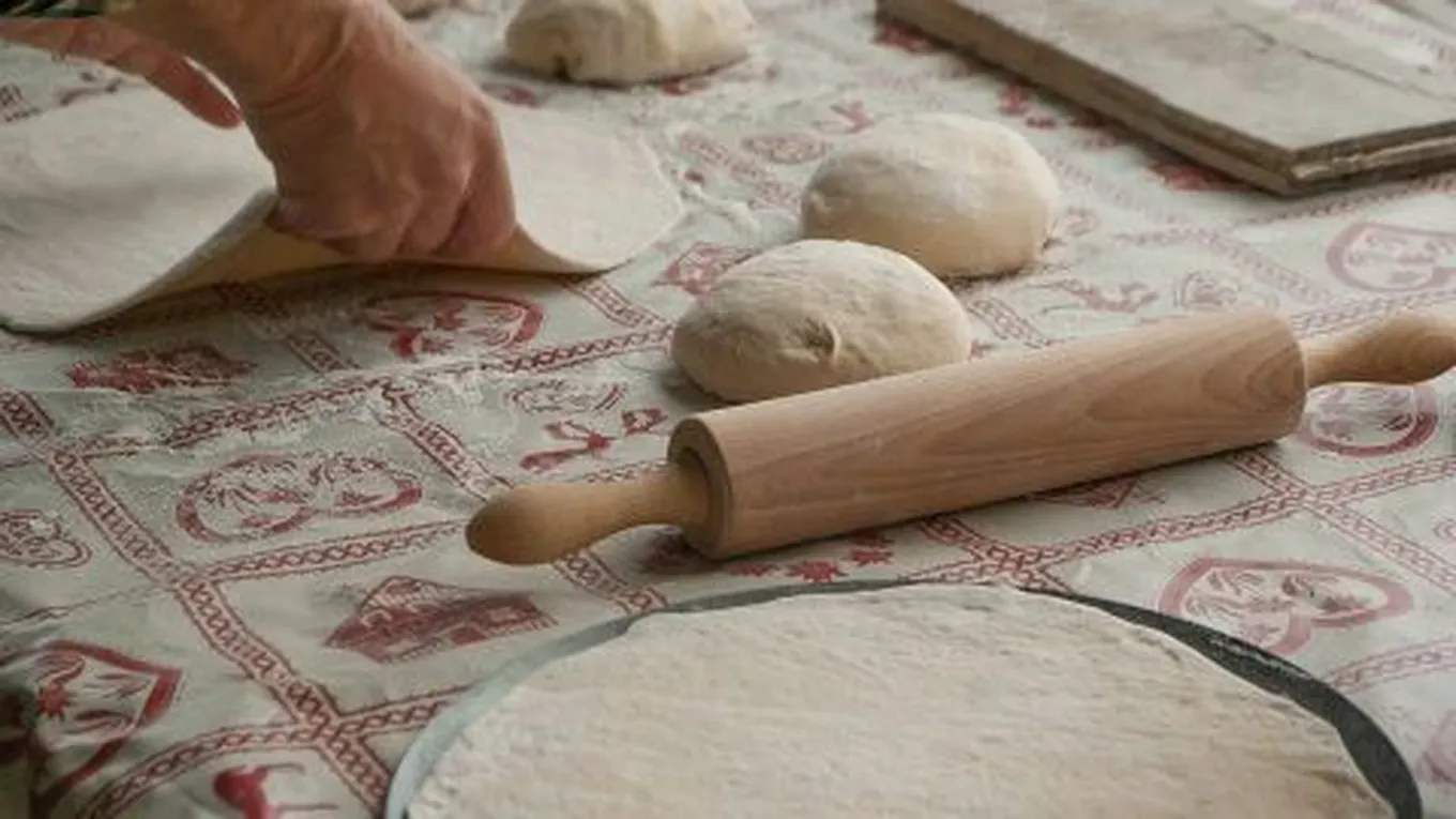 - تعجن العجينة مجدداً للتلخص من الهواء الموجود فيها فوق سطح مرشوش بالطحين، أو تقسم إلى دوائر بحسب الحجم المرغوب، ثمَّ ترق كل كرةٍ باليد أو النشابة إلى سمك نصف سنتمتر.