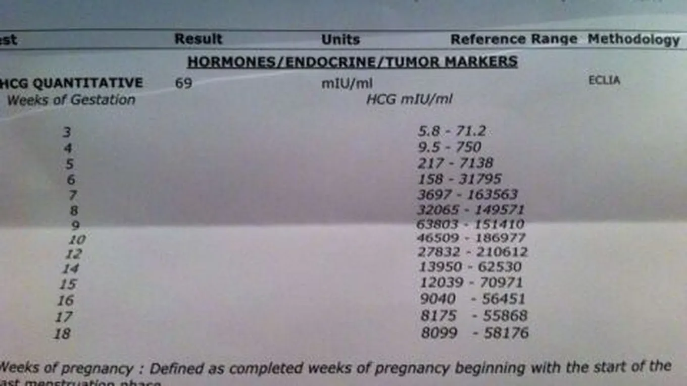 وعند عمل تحليليْن لهرمون الحمل يفصل بينهما يومان، فإن أقل زيادة طبيعيّة في مستواه هي ثلاث وخمسون بالمئة، وإن كان أقل من هذه النسبة فإنّ الطبيب يضع احتمالات لوجود مشاكل في الحمل.