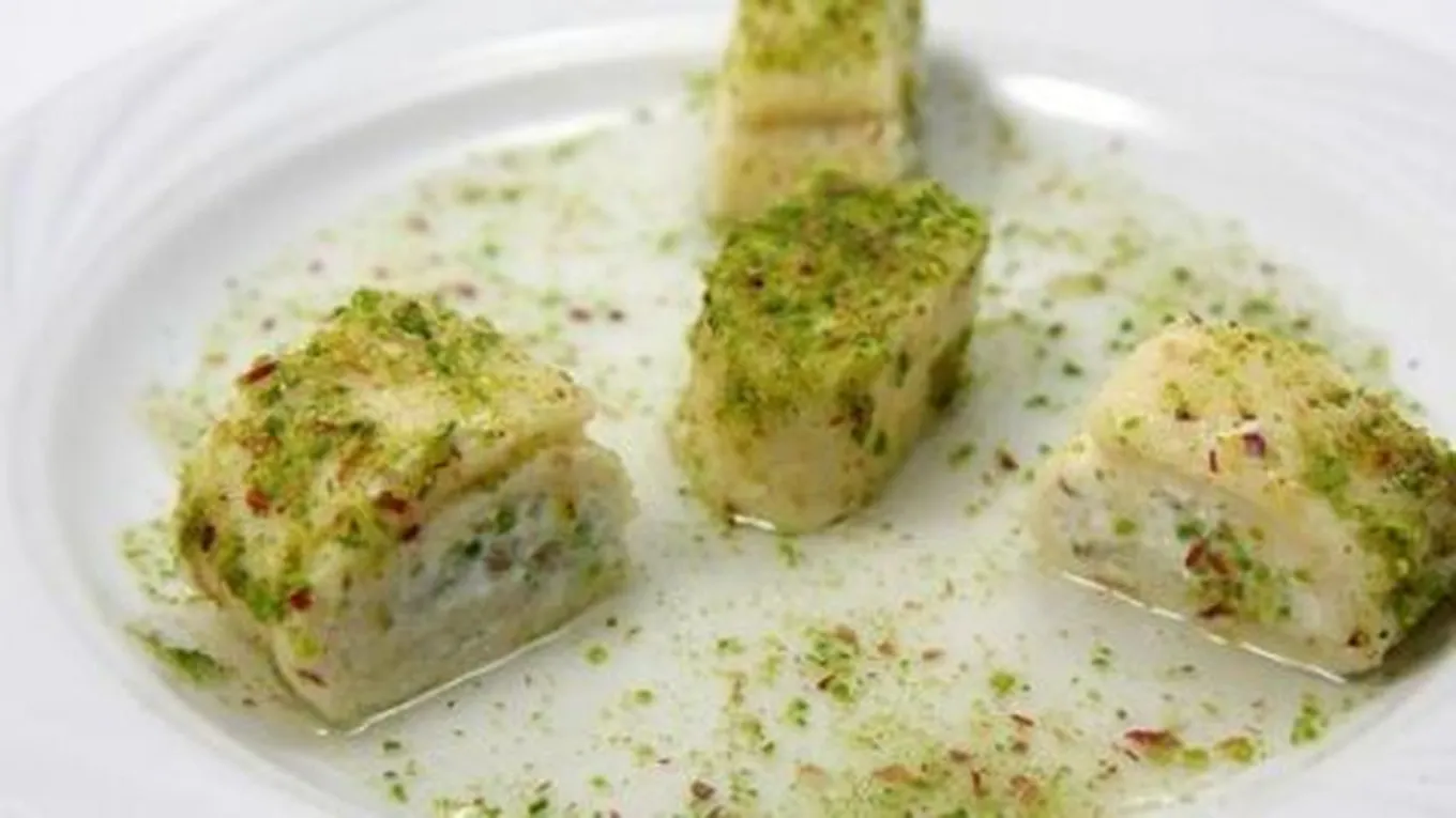 - ضعي مقدار ملعقة كبيرة من القشطة في وسط كل مربع ثم لفي العجينة على الحشو. ضعي لفائف حلاوة الجبن في طبق للتقديم ثم زيني بالفستق الحلبي.
