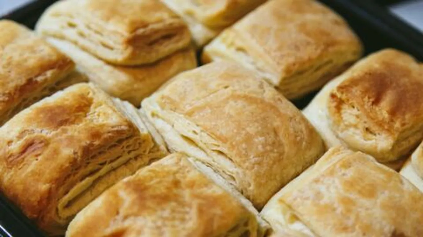 - وضع مربع من عجينة الباستري على طاولة العمل وعمل شق باستخدام سكينة حادة على أحد الزوايا على شكل (‹) مع ترك مسافة عن الحافة ثمّ عمل شق أخر على شكل (›) على الزاوية المقابلة للزاوية الأولى.