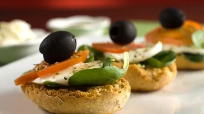 - ادهني اللبنة على جميع قطع الخبز، وزيّنيها بأنصاف حبات البندورة الكرزيّة، ومفروم النعناع، وشرائح الزيتون الأخضر، وتحكمي بكمية الخضار المضافة على كلِّ نصف، حسْب رغبتك.