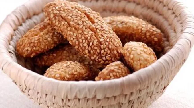 - نضع الدقيق في وعاء، ونرشّ علية الملح، ثم نعمل حفرة في الوسط، ونضيف السمسم.