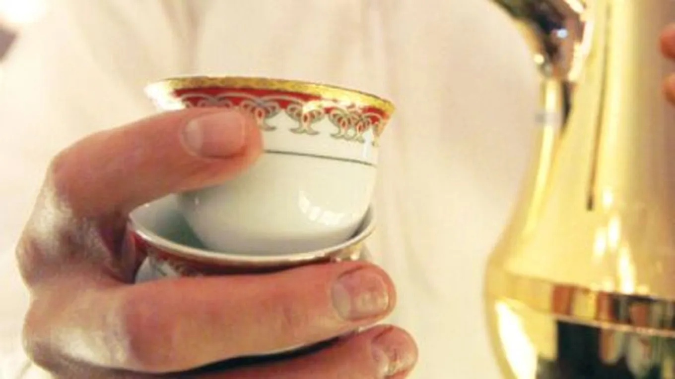 - نطفئ الغاز ونترك القهوة جانباً حتى تركد، ثم نضع الهيل والزعفران في وعاء آخر، ونصب فوقه القهوة المحضّرة، بعد تصفيتها.