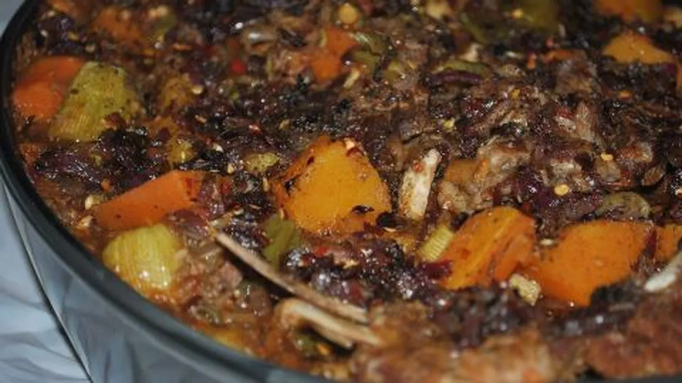 - نقشر اليقطين ونغسله ونقطعه لشرائح ثم نضيف اللوبيا الخضراء للحمة ونضيف الخضراوات الأخرى المقطعة ونترك القدر على النار حتى تنضج الخضراوات.