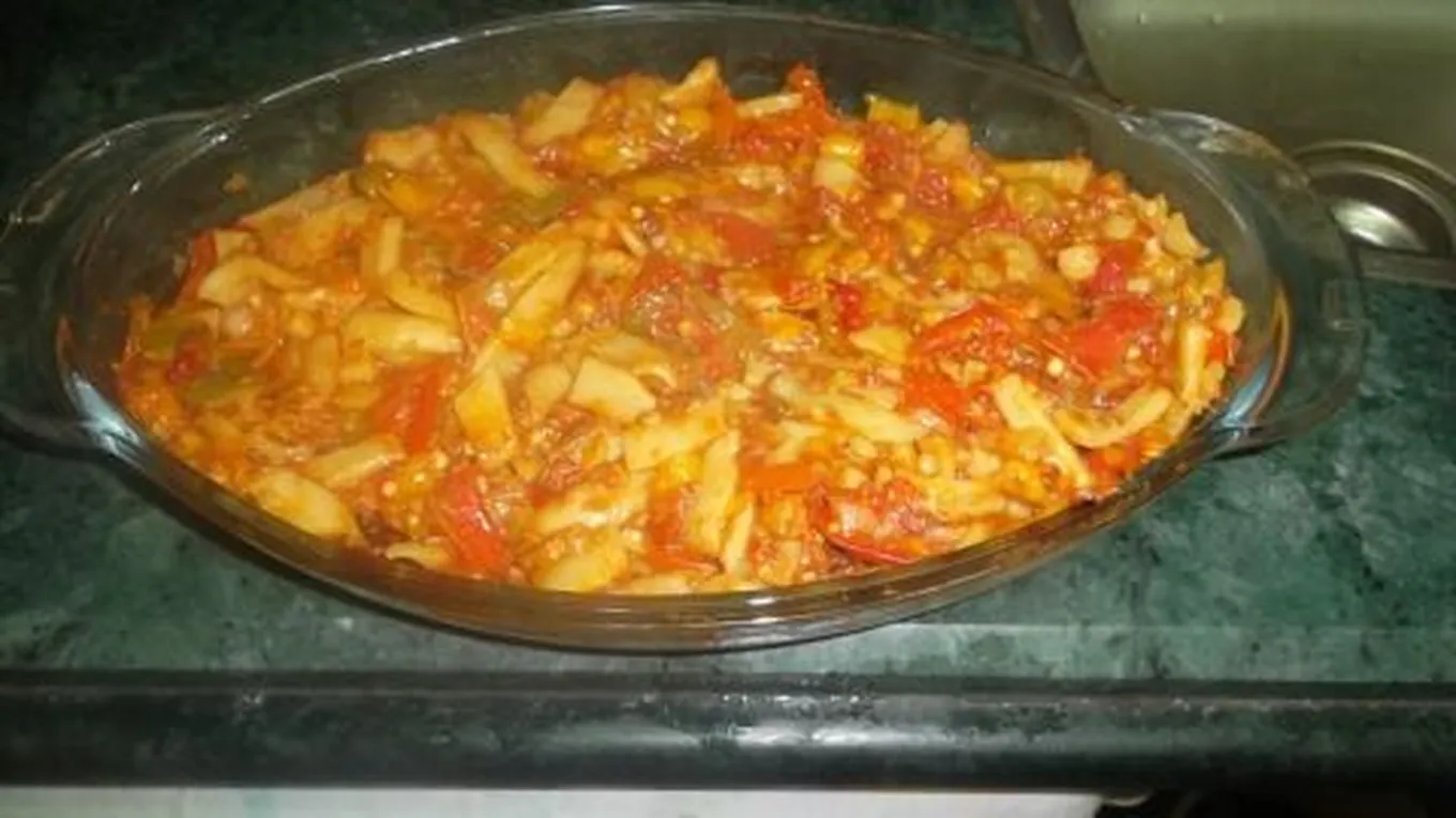 - نأتي بالبصل، ويفرم ثمّ يضاف إليه الثوم المفروم، وبعد ذلك نضع الطماطم المفرومة والفلفل المفروم والكرفس، ونخلطها مع بعضها البعض، ونضعها في صينيّة أو ما يسمى بالطاجن ( بايركس).