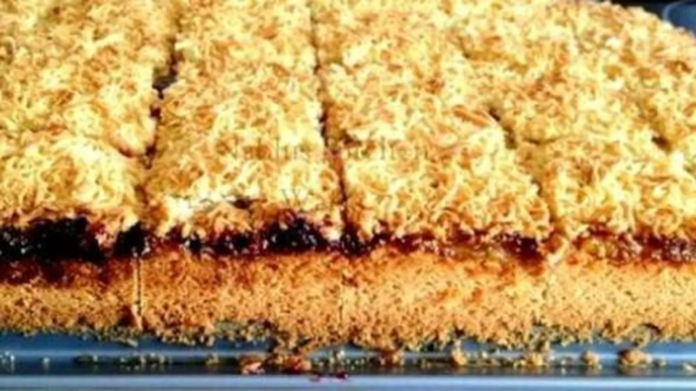 - ندهن الصينية بالقليل من الزيت النباتي أو الطحينية حسب الرغبة، من جميع الأطراف، ونضع فيها القسم الأول بشكل مستوي، ثمّ نضع فوقها المربى.