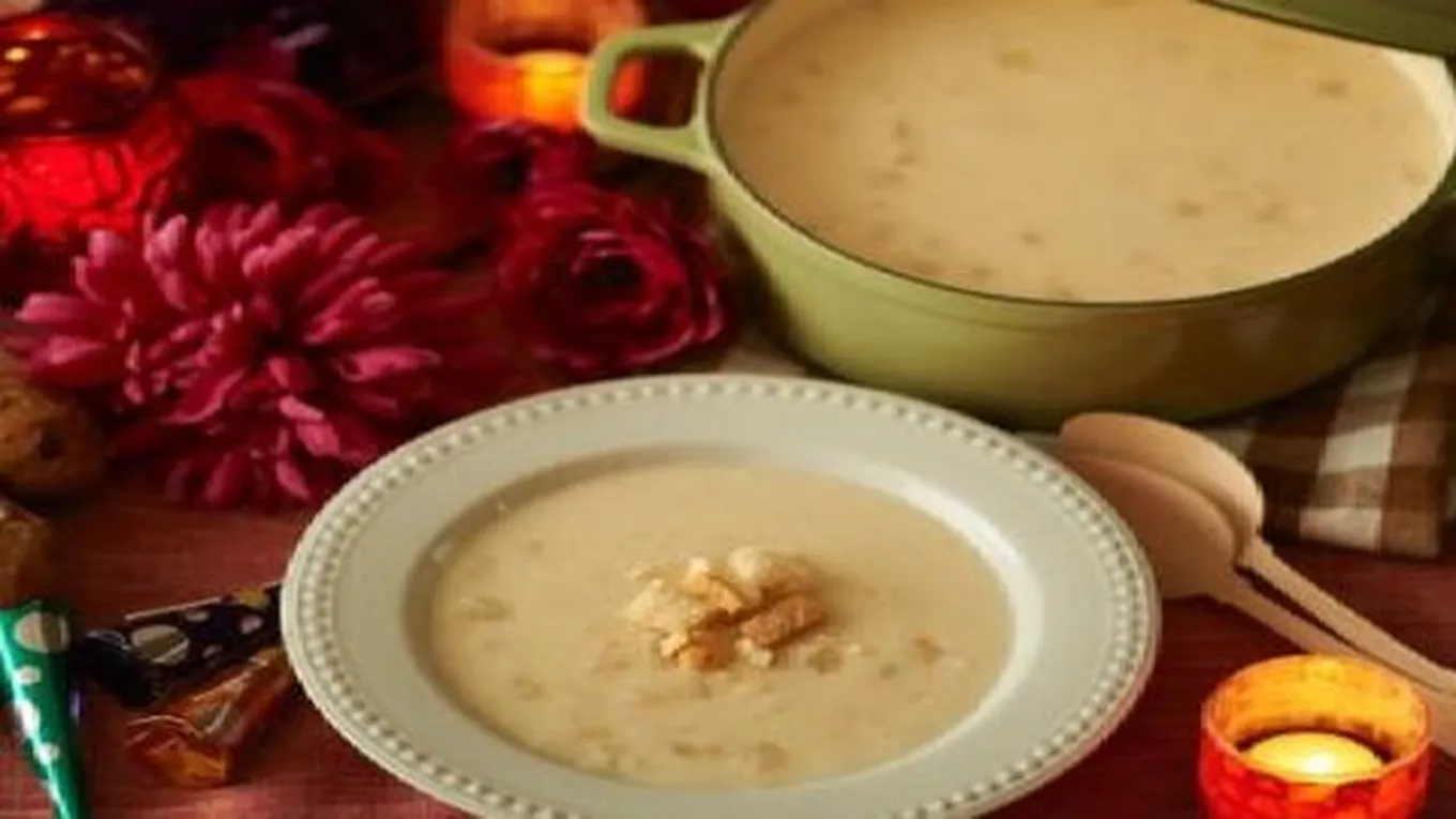 - يذوب الطحين في الحليب للتخلص من التكتلات، ثمَّ يضاف المزيج إلى القدر، ويترك الحساء حتى يغلي فوق نار هادئة مع الخفق المستمر لمنع التكتل.