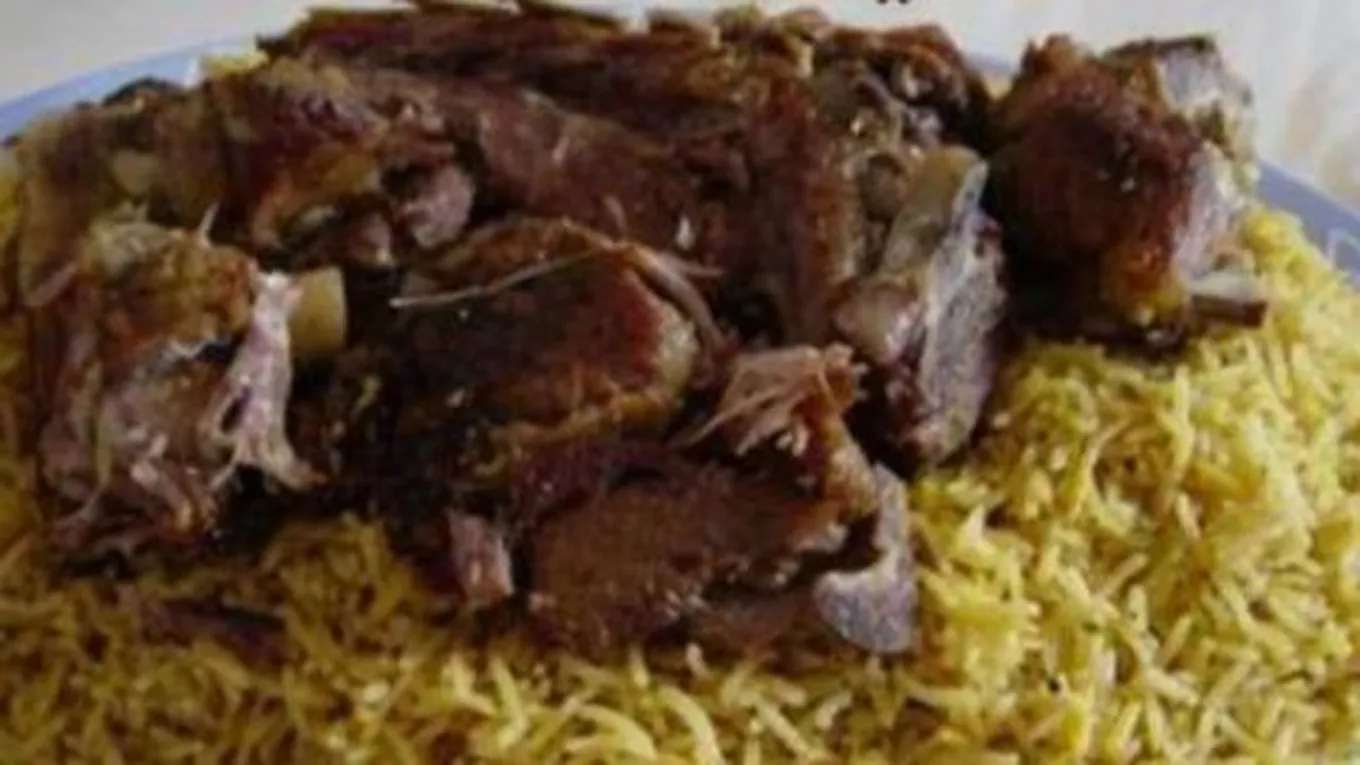 - تقليب الأرز باستخدام الشوكة، ثم سكبه في وعاء تقديم واسع، وإخراج قطع اللحم من الملح ووضعها على الأرز، ثم تقديم المظبي فورًا.