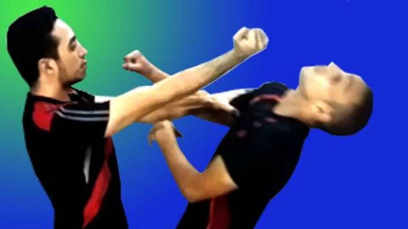 - التمرين الخامس:عندما يدفعُك الخصمُ بعنفٍ باتجاه حائط ويضغط على رقبتك بيديه، هنا عليك الإمساك بيديْه بقوّة لتقاومه وتبعده عن عنقك، وغيّر اتجاهَك بشكلٍ مفاجئ، واركله بين ساقيْه بمشطِ قدمك اليمنى، حتّى يُفلّت رقبتك.