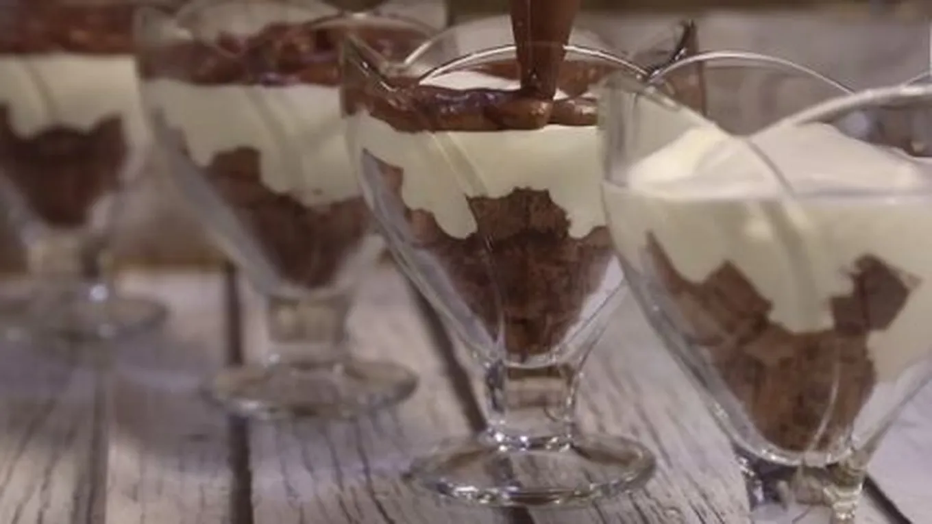 - يسكب المزيج في كاسات التقديم بحيث يشكل الطبقة الثالثة من الحلى، ثم يُسوّى سطحها بشكل مستقيم باستخدام سكين مسطح عريض.