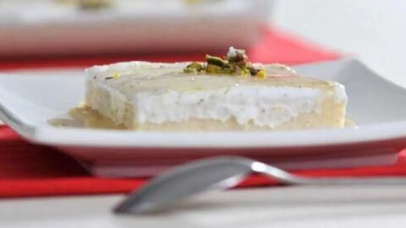 - نصب المزيج في البايركس، ونفرده بالتساوي وبعد أن يبرد نفرد علبة من القشطة على وجهها، ونزيّنها بالفستق الحلبي أو اللوز، ونُحضّر القطر، ونضع فوقه حلى ليالي لبنان (ماء وسكر وعصير ليمون)، وبعدها نُقدّم الحلى.