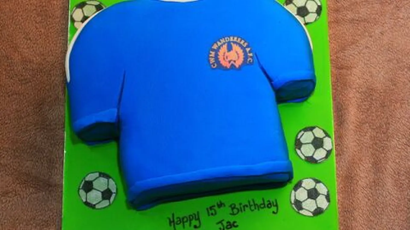 - وضع الشريط الأصفر على الكيكة وتشكيلها على شكل ياقة قميص، ثمّ وضع الزرّين المُشكّلين من العجينة البيضاء عليها.