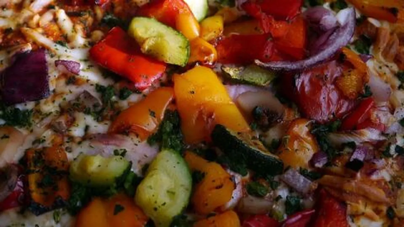 - توزيع صلصة البيتزا على العجينة باستخدام سكين معدنية أو باستخدام ملعقة طعام وتوزيع الفلفل، المشروم، الزيتون، جبن الشيدروجبن الموزاريللا.