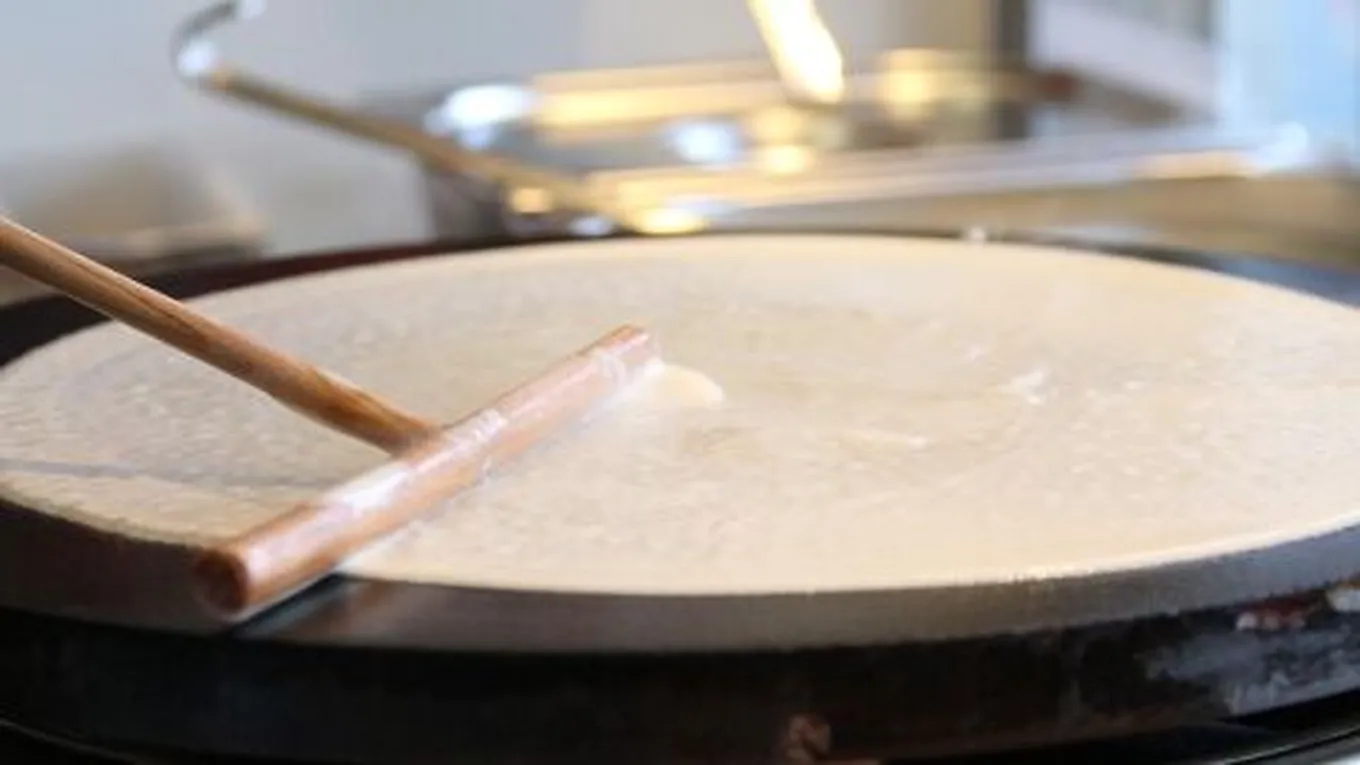 - تسخين وعاء حراري خاص بالكريب أو مقلاة مسطحة ذات طبقة مقاومة للالتصاق على حرارة عالية.