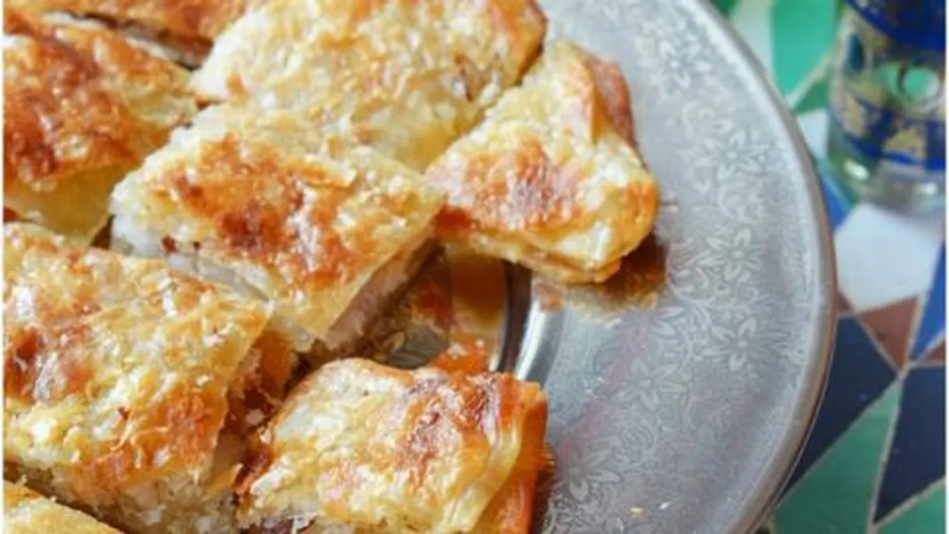 - إدخال الطبق إلى الفرن لمدّة ثلاثين إلى أربعين دقيقة إلى أن يصبح جافاً وتصبح العجينة مائلة إلى اللون الذهبي الفاتح، ثمَّ إخراج الطبق من الفرن وتركه يرتاح قليلاً.