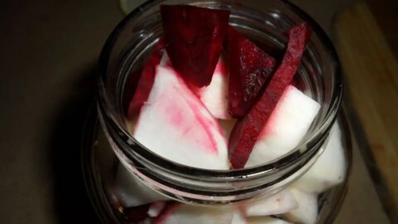 - وضع شرائح الشمندر، واللفت في المرطبان.