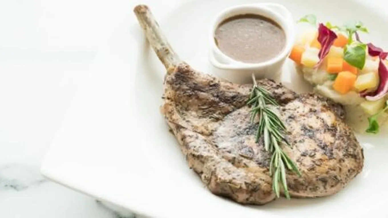 - تزيين اللحم بأوراق الأعشاب الطازجة ثمَّ تقديمها مع جوانح البطاطس المحمرة.