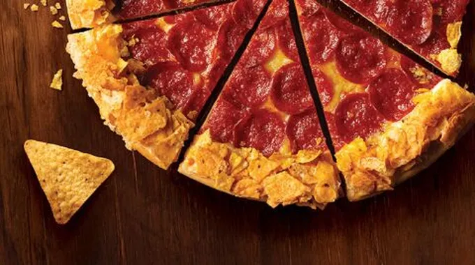 - رصّي الدوريتوس حول العجين، ثمَّ أدخلي البيتزا إلى الفرن واخبزيها حتّى تنضج وتتحمّر أطرافها.