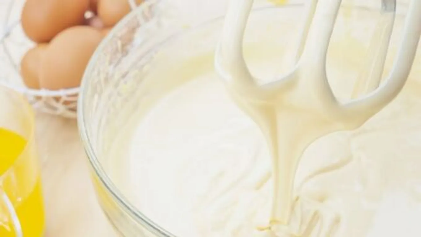 - ترك الخلاط يخفق البياض على سرعة متوسطة وإضافة خليط السكر بهدوء أثناء التشغيل على شكل خيط رفيع إلى أن تنتهي الكمية.