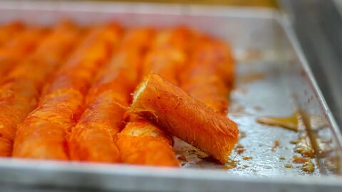 - مد الكنافة جيداً ثمّ شويها في الفرن المحمّى من قبل بعشر دقائق.