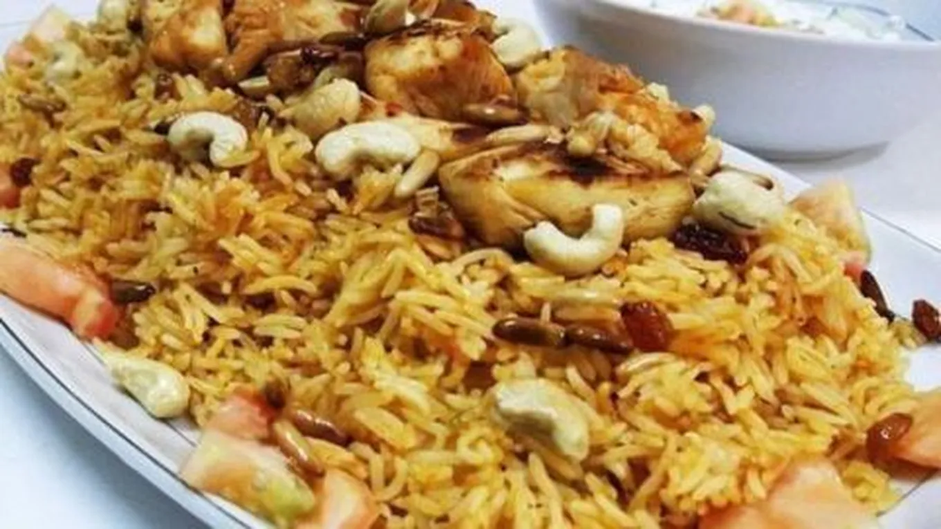- نضع الأرز في طبق التقديم، ونرتب قطع الدجاج فوقة، مع إمكانية إضافة الصلصة الحارة، والمكسرات المقلية كاللوز.