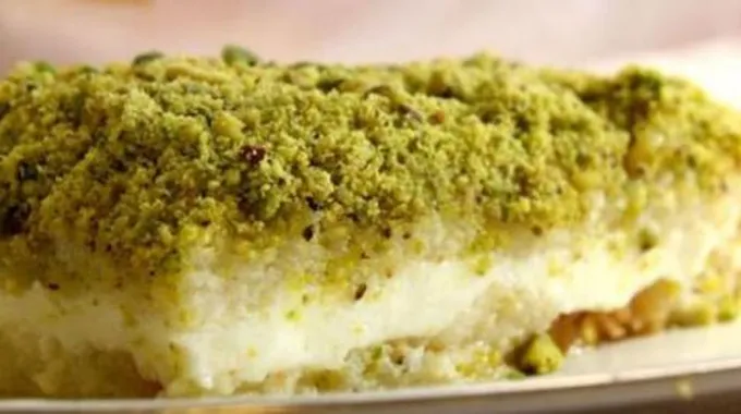 - إضافة الفستق الحلبي إلى باقي كمية الخليط وتقليبه، ثمَّ صبه فوق الخليط في طبق التقديم.