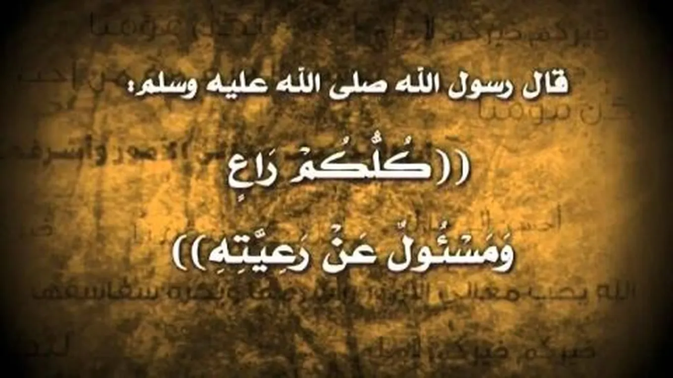 عن عبد الله بن عمر رضي الله عنهما عن النبي صلى الله عليه وسلم قال: (أَلَا كُلُّكُمْ رَاعٍ، وَكُلُّكُمْ مَسؤولٌ عَنْ رَعِيَّتِهِ، فَالْأَمِيرُ الَّذِي عَلَى النَّاسِ رَاعٍ، وَهُوَ مَسْؤولٌ عَنْ رَعِيَّتِهِ، وَالرَّجُلُ رَاعٍ عَلَى أَهْلِ بَيْتِهِ، وَهُوَ مَسْؤولٌ عَنْهُمْ، وَالْمَرْأَةُ رَاعِيَةٌ عَلَى بَيْتِ بَعْلِهَا وَوَلَدِهِ، وَهِيَ مَسْؤولَةٌ عَنْهُمْ، وَالْعَبْدُ رَاعٍ عَلَى مَالِ سَيِّدِهِ وَهُوَ مَسْؤولٌ عَنْهُ، أَلَا فَكُلُّكُمْ رَاعٍ، وَكُلُّكُمْ مَسْؤولٌ عَنْ رَعِيَّتِهِ) [متفق عليه].
