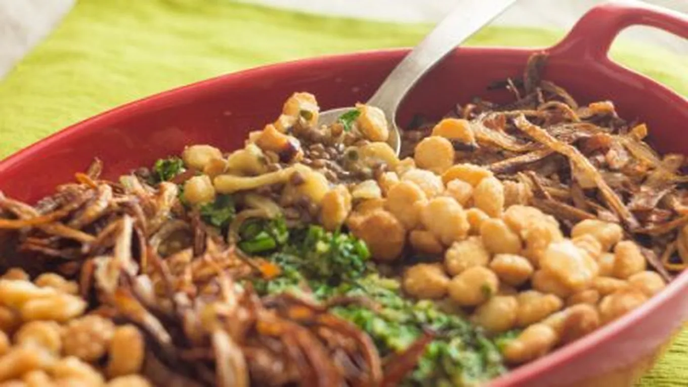 - نسكب مزيج الحراق بأصبعه في صواني البايركس، ونزين الوجه بالبصل المحمر والخبز المقطّع المقلي، والثلث المتبقي من خليط الكزبرة والثوم.