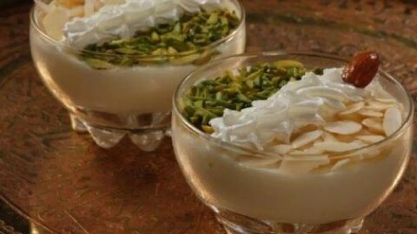 - فانيلا، وماء زهر، وآيس كريم بنكهة الفانيلا، وشيرة، وفستق حلبي مطحون حسب الرغبة.