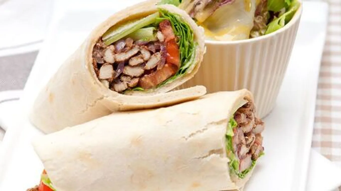 - يُفتح الخبز من النصف، ويُحشى بالشاورما، ويُلف.