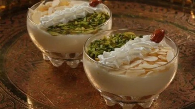 - نرش عليها مجروش الفستق الحلبي أو اللوز بشكلٍ جميل، ونقدّمها باردةً للضيوف.