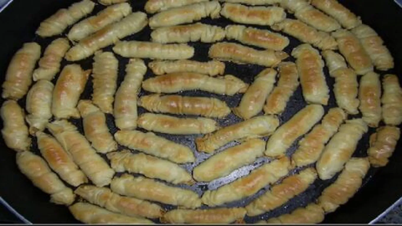 - نأخذ المستطيل ونحشوه بالفستق ونبرمه، ومن الممكن الاستعانة بعود خشبي بلفّ العجينة عليه ثمّ سحبه لتتشكّل العجينة بشكل أسطواني ونرتّبه بصينيّة مدهونة بكمّية جيّدة من الزبدة وندهن وجه المبرومة بالزبدة الذائبة.