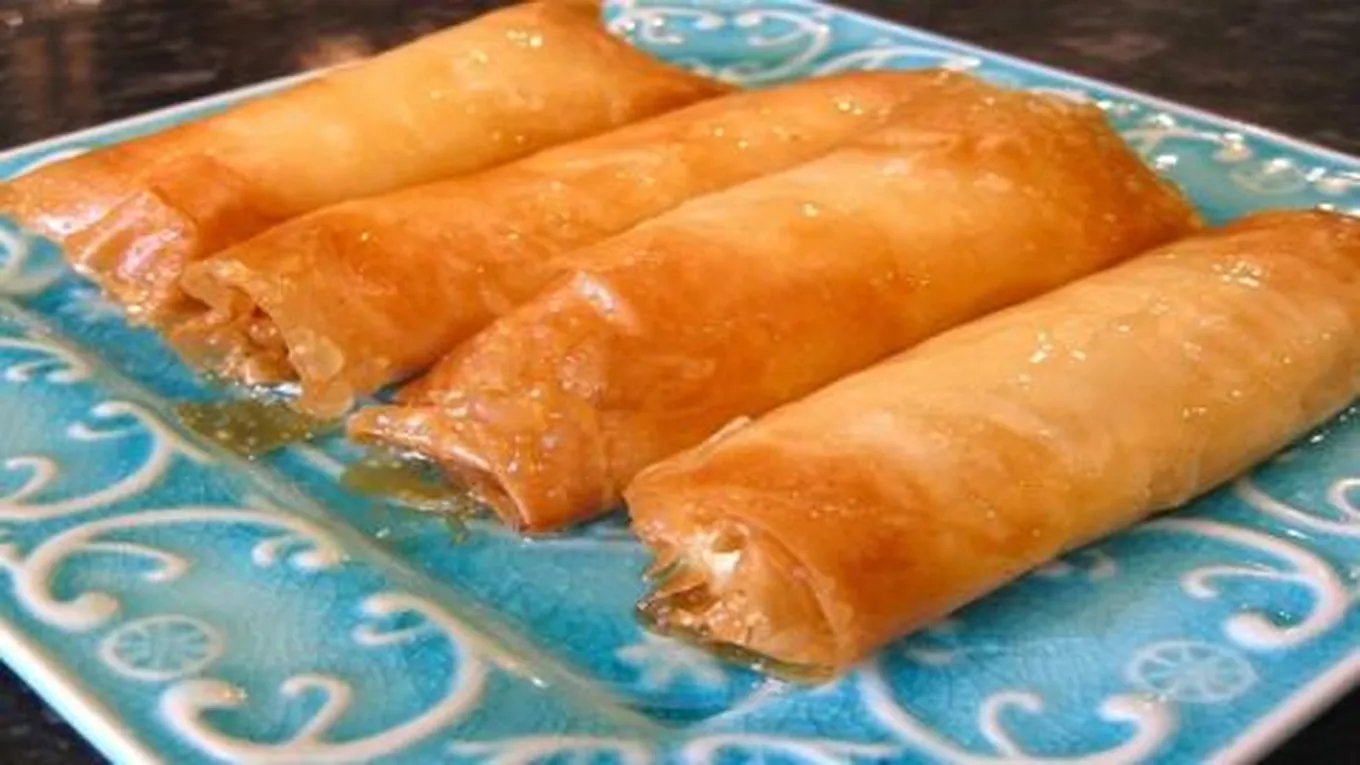 - نضع مقداراً من الحشوة التي حضّرناها على طرف العجين ونطوي الأطراف ثمّ نلفّ العجينة لتصبح بشكل اسطوانيّ.