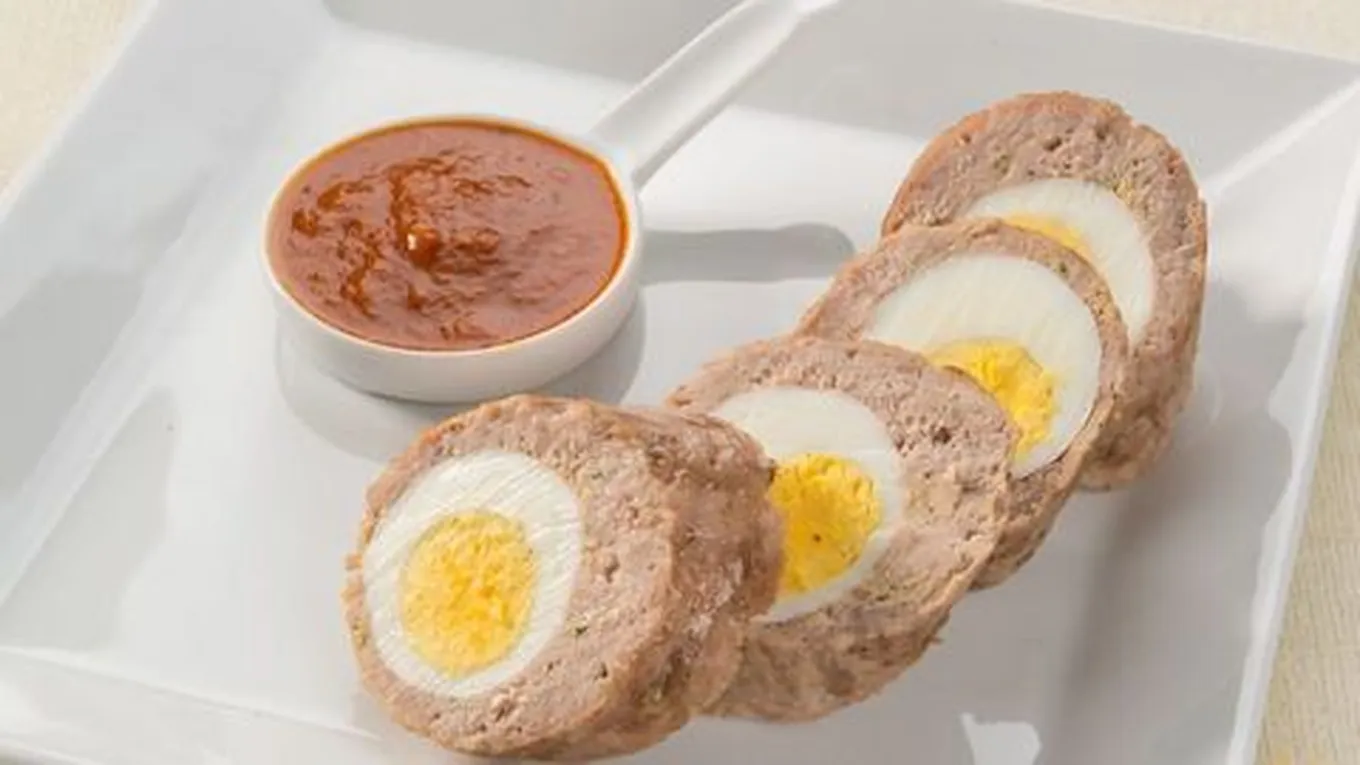 - نضع على كل شريحة لحم كمية مناسبة من الحشوة، ونسوي سطحها براحة اليد، ثم نضع فوقها بيضة كاملة مسلوقة.