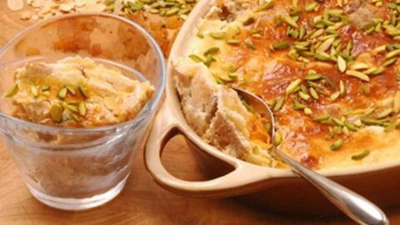 - زيّني طبق أم علي بالتوست بالفستق الحلبي، والجوز.