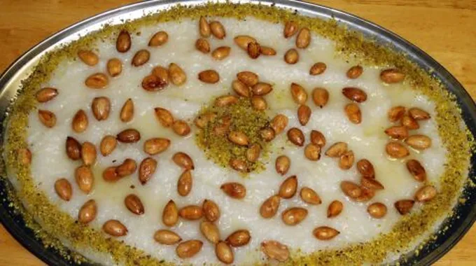 - نضع حلاوة التمن في طبق التقديم، ونزيّنها بالّلوز والفستق.