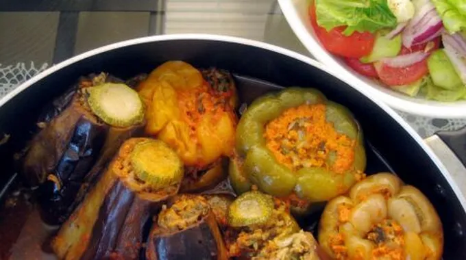 - تُحشى حبات الكوسا والباذنجان المقلية باللحم المفروم المقلي، وتوضع في قدر عميق جديد، ويوضع عليها ثقل حتى لا تتفتّح الحبات.