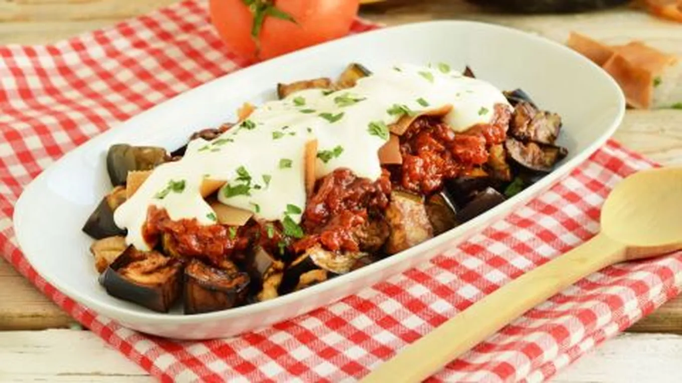 - نضع الخبز المقلي في طبق، ثم نضع الباذنجان فوقه، ثم نضيف باقي الصلصة.