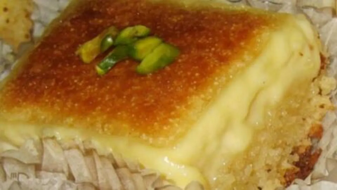- نسكب مزيج القشطة فوق طبقة العجين المخبوزة.