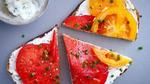 - نرفع التّوست من الشّواية وندهن كل شريحة، ومن ناحية واحدة بالجبنة الكريميَّة البيضاء ثم نضع شرائح الطماطم والجرجير.